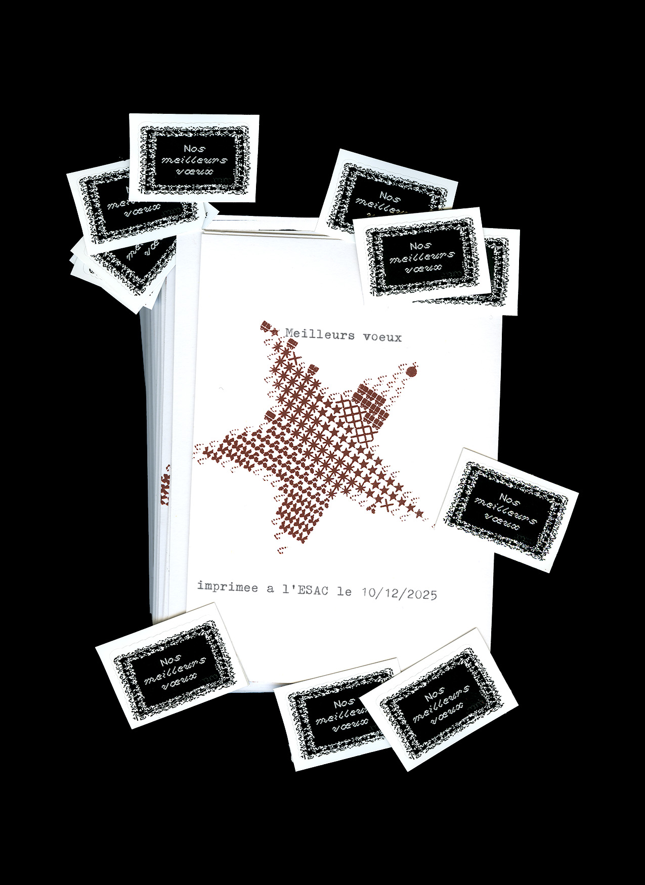 L’ensemble des supports possèdent un patern commun : le gaufrage. Ce travail questionne les techniques d’impressions frugales et d’économies de moyens.