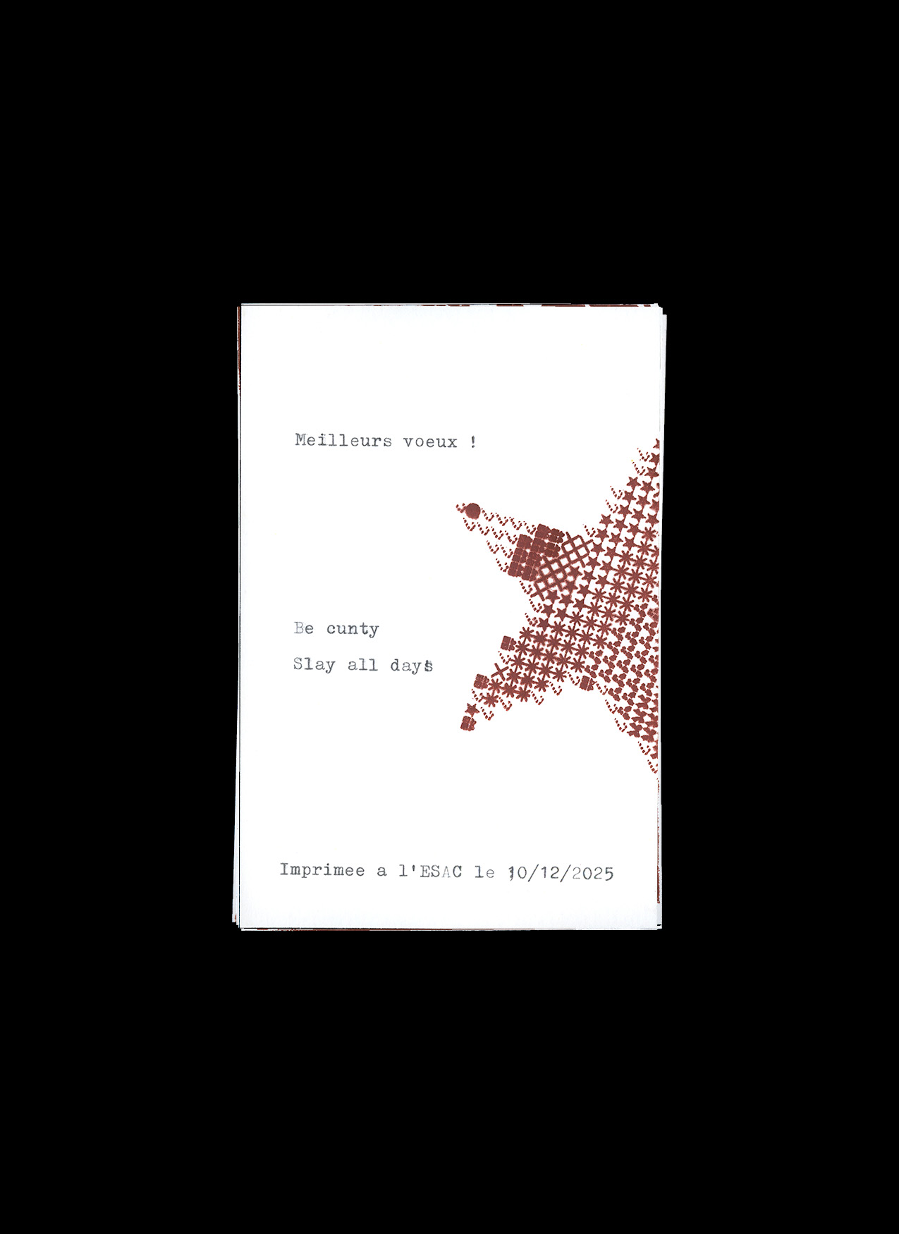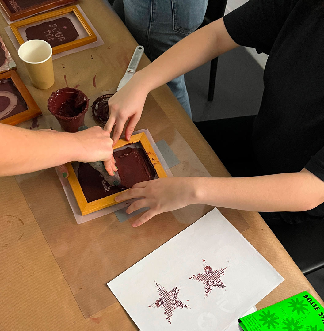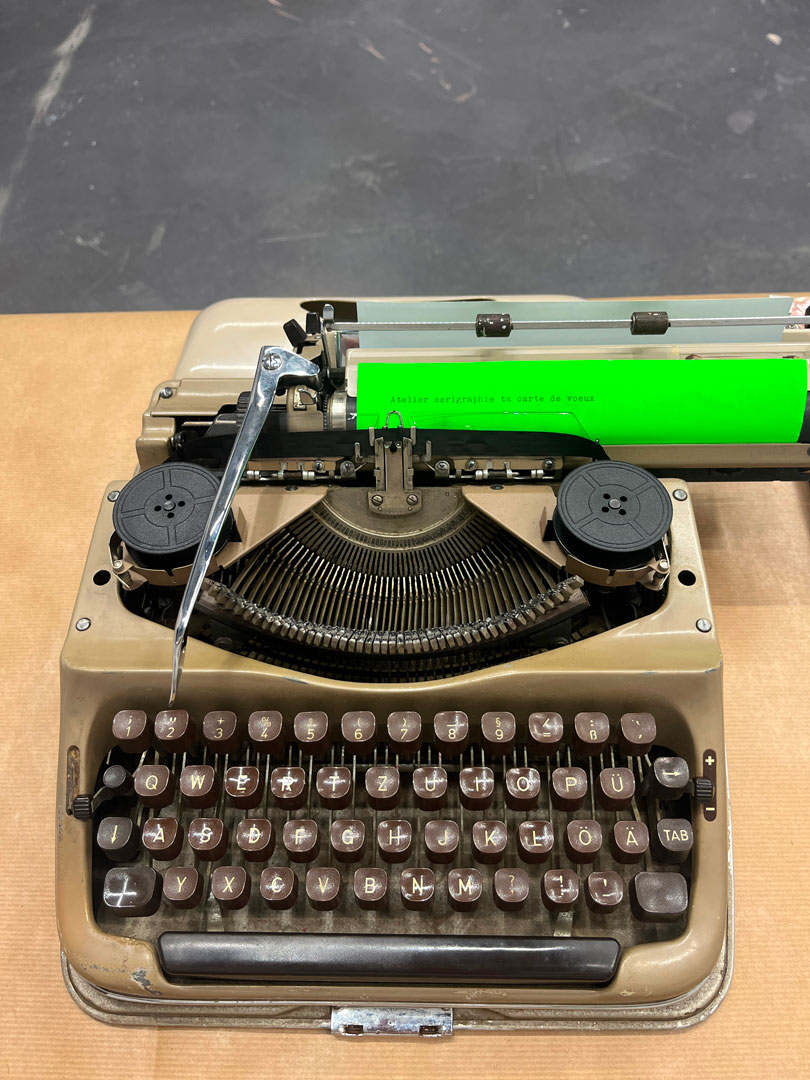 ↳ À l'occasion des fêtes de fin d'année, l'atelier propose une initiation à la sérigraphie pour créer des cartes de vœux avec un choix de motifs et d'un message personnalisé à la machine a écrire.